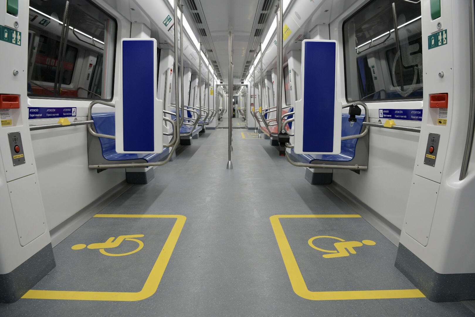 - S’han designat espais lliures de seients amb capacitat per allotjar quatre passatgers usuaris de cadira de rodes, dos en cada cotxe extrem del tren i en les proximitats de les primeres portes. Tots els espais reservats estaran sensoritzats i disposen dels mateixos mecanismes i dispositius que els passatgers poden utilitzar en altres zones, com el botó de parada, el tirador d'emergència i l’intèrfon, situats a una altura que els posi a l'abast de les persones usuàries de cadires de rodes que ocupin l'espai reservat. Es col·locarà el símbol internacional d'accessibilitat de color groc en el sòl de l'espai reservat, amb la finalitat de reforçar-ne la senyalització i garantir l'ús preferent de l'espai.