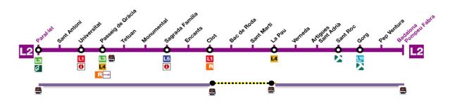 L'L2 funcionarà amb normalitat entre Paral·lel i Clot, d'una banda, i entre La Pau i Badalona/Pompeu Fabra per l’altra, deixant únicament fora de servei les estacions de Bac de Roda i Sant Martí