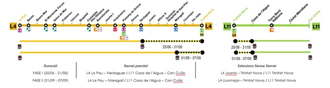 Els treballs obligaran a tallar el servei entre els dies 25 de juny i 31 d’agost, ambdós inclosos, a l’L4 des de Verdaguer a Trinitat Nova. A partir de l’1 de setembre es recuperarà el servei des de Verdaguer fins a Maragall, reduint l’afectació a les darreres quatre estacions de la línia fins al 7 de setembre. A l’L11 el tram sense servei serà només de Trinitat Nova a Casa de l’Aigua però durarà des del 25 de juny fins al 7 de setembre.