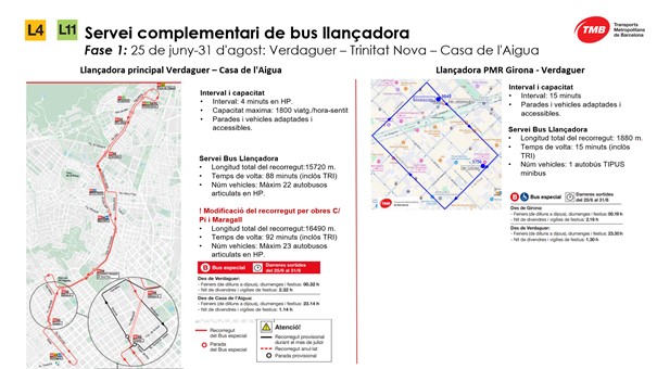 Entre el 25 de juny i el 7 de setembre funcionarà un servei especial d’autobús entre Verdaguer (L4) i Casa de l’Aigua (L11), que es reduirà a partir de l’1 de setembre quan l’L4 de metro recuperi el servei entre Verdaguer i Maragall. A banda, aquest servei de bus especial tindrà una modificació del recorregut quan comencin les obres al carrer Pi i Margall a mitjans de juliol i durant un mes i mig, que afecten la parada que fa al Metro de Joanic.