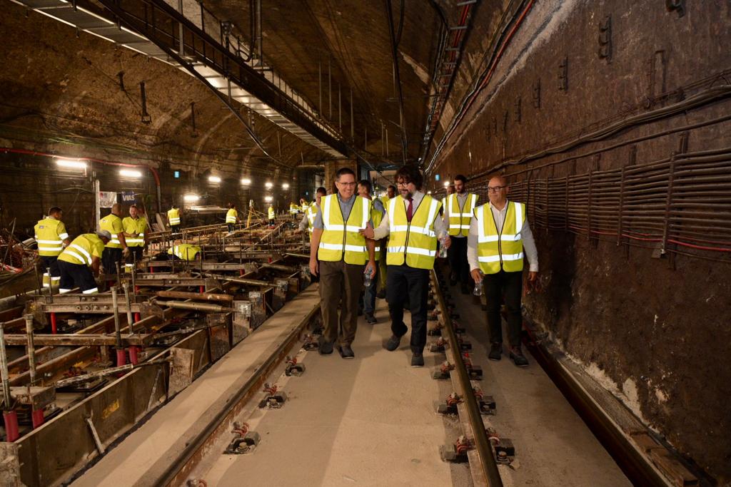 La presidenta de TMB, Laia Bonet, i el secretari general del Departament de la Vicepresidència i Polítiques Digitals i Territori, Ricard Font, visiten les obres per constatar que s’està complint el calendari i que els dispositius de mobilitat alternativa per cobrir el tram afectat estan funcionant correctament.