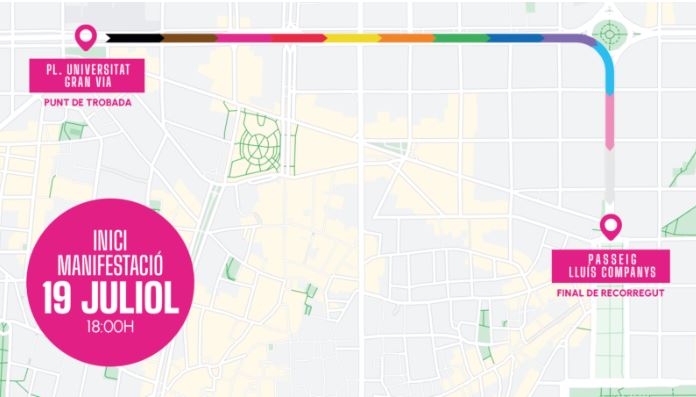La desfilada reivindicativa tindrà el mateix recorregut que l’edició passada. La concentració prèvia ocuparà la Gran Via, des del carrer d’Urgell fins a la plaça Universitat, des d’on iniciarà la marxa a les 18 h. per avançar per la Gran Via amb direcció pl. Tetuan i continuar pel passeig de Sant Joan i pg. de Lluís Companys, finalitzant al pg. de Pujades.