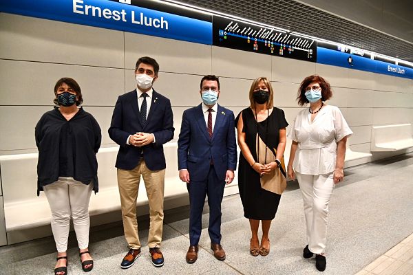El president de la Generalitat, Pere Aragonès, ha presidit aquest matí la inauguració de l'estació de metro Ernest Lluch, acompanyat del vicepresident i conseller de Polítiques Digitals i Territori, Jordi Puigneró; l'alcaldessa de l'Hospitalet, Núria Marín; la presidenta de TMB i regidora de Mobilitat de Barcelona, Rosa Alarcón; i la filla d'Ernest Lluch, Rosa Lluch