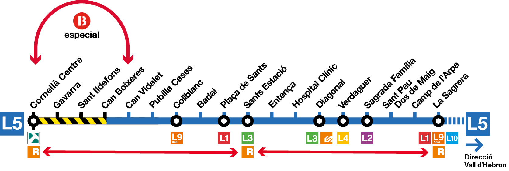 Des de dissabte vinent, 3 de desembre, fins al diumenge 11 de desembre (tots dos inclosos), el servei de metro quedarà interromput parcialment a la línia 5 entre les estacions de Cornellà Centre i Can Boixeres per unes obres de millora que durà a terme Transports Metropolitans de Barcelona (TMB). La resta de la línia 5, entre Can Boixeres i Vall d’Hebron, funcionarà amb normalitat.