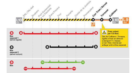 També la mateixa xarxa de metro és una bona alternativa segons l’itinerari. Així, l’L9 Sud de metro des de Collblanc i Torrassa, permet anar en direcció a Aeroport T1, fins a Can Tries | Gornal i allà enllaçar amb el servei de bus especial. A banda, la línia V3 de bus cobreix el tram afectat entre Zona Franca i Ciutat de la Justícia, i la línia 109 cobreix el tram afectat entre Ecoparc i Foneria.