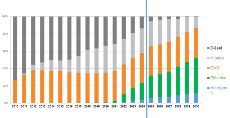 L’aposta de TMB per la sostenibilitat a la seva flota de bus es mostra en el següent gràfic on es pot veure com evolucionarà el nombre de vehicles per tipus de combustible, reduint els dièsel i els híbrids mentre guanyen terreny els elèctrics i els d’hidrogen: