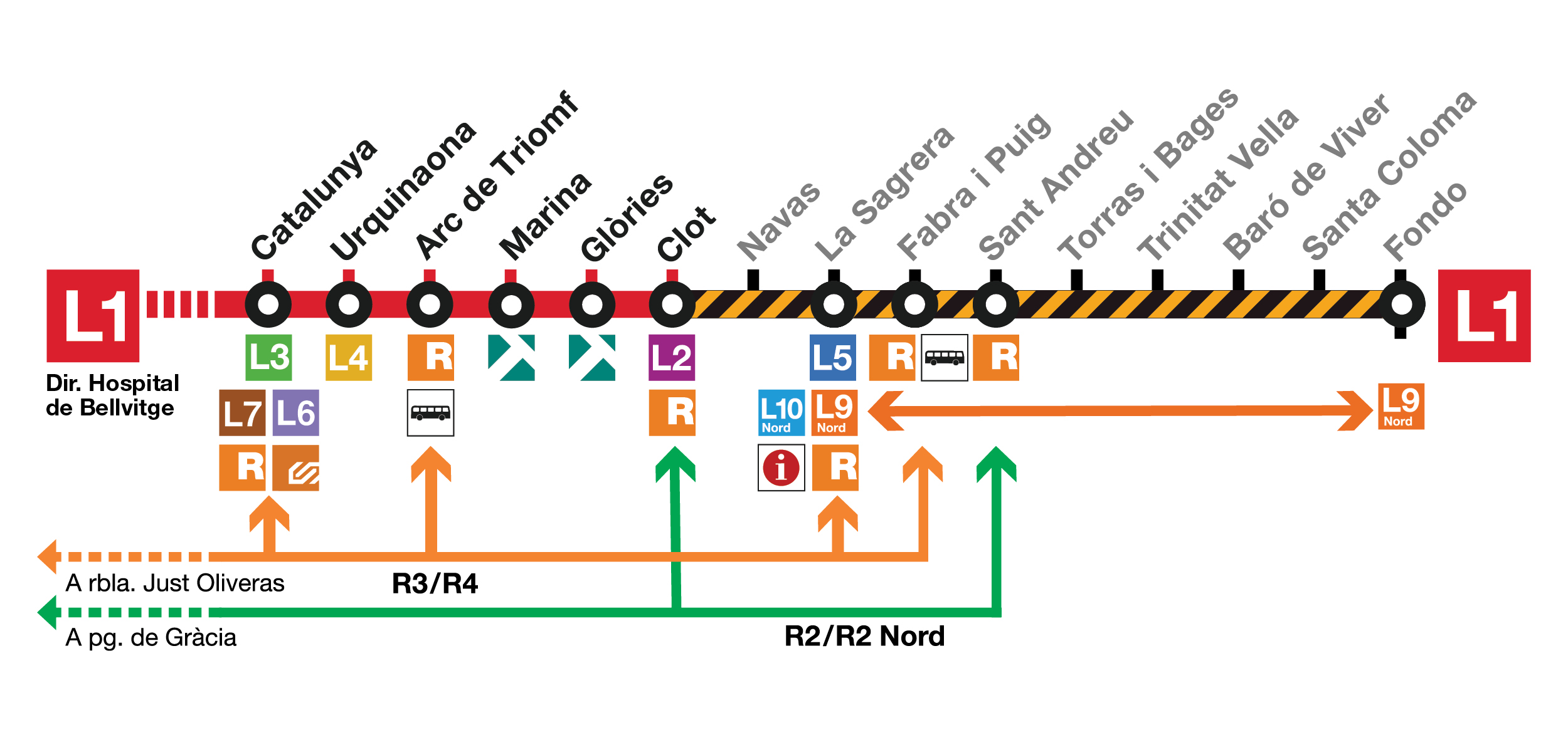 L’execució de tots aquests treballs és d’una elevada complexitat (comporta l’obertura de tres pous d’extracció i entrada de materials) i resulta incompatible amb la circulació de trens. Sospesades totes les opcions, s’ha escollit la de menys afectació: concentrar les obres en el mínim de temps, dos mesos, coincidint amb l’època de l’any amb menys mobilitat urbana. D’aquesta manera, el servei de metro a la línia 1 haurà de quedar suspès temporalment entre les estacions de Clot i Fondo (a Santa Coloma de Gramenet) entre el 29 de juny i el 30 d’agost, tots dos inclosos. La resta de la línia, entre Hospital de Bellvitge i Clot, funcionarà amb normalitat.