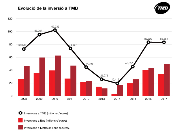Transports Metropolitans de Barcelona (TMB) ha disposat l’any 2017 d’un pressupost d’inversions de 83 milions d’euros per efectuar millores als actius de les xarxes de metro i autobusos així com als sistemes tecnològics i de comunicacions de les àrees de negoci i de l’entorn corporatiu. Aquesta xifra, similar a la de l’any anterior, segueix suposant un increment del 90% respecte de les inversions efectuades el 2015, i del 250% respecte de la xifra del 2014.