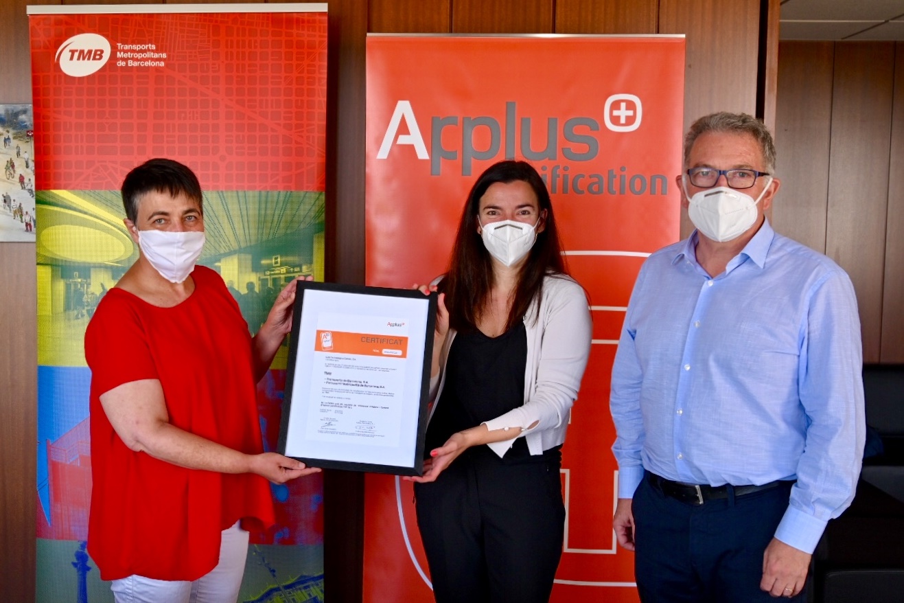 Transports Metropolitans de Barcelona (TMB) ha obtingut el segell de seguretat per als seus procediments d’higiene i protecció per evitar la propagació de virus en les xarxes de metro i autobusos així com en l’activitat laboral a les seves instal·lacions. La certificació oficial ha estat lliurada avui per la gerent de certificació de sistemes d’Applus, Carla Debat, a la presidenta de TMB, Rosa Alarcón, abans que sigui incorporada a la retolació dels vehicles i dependències de l’empresa els pròxims dies.