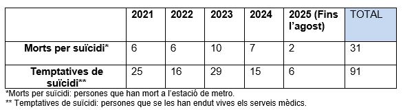 Segons les dades recollides internament per TMB, en els últims cinc anys, s’han registrat un total de 122 incidències en aquest àmbit: 91 temptatives de suïcidi i 31 que han acabat amb la vida de la persona. Les dades, a més, indiquen que aquestes incidències no segueixen cap patró específic: no hi ha estacions més afectades que d’altres, ni tampoc una època de l’any amb més incidències relacionades.