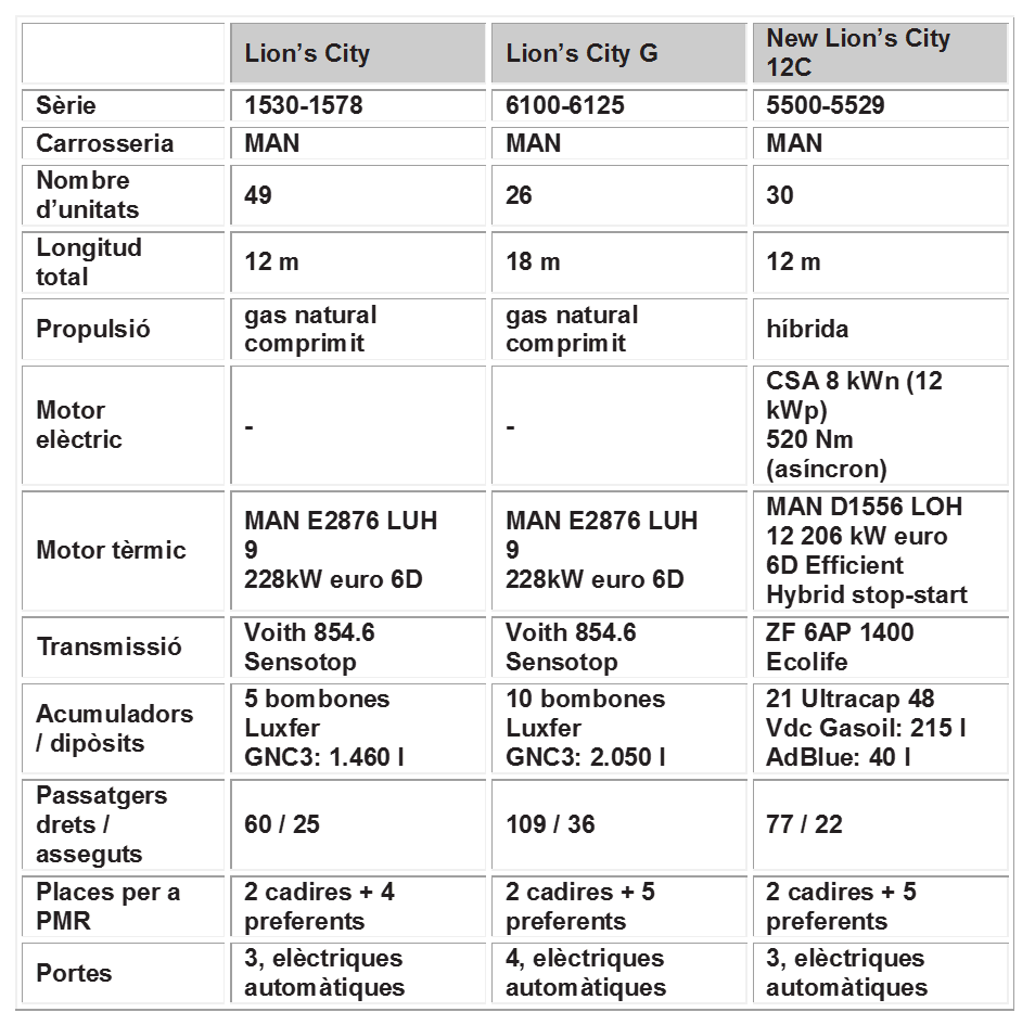 En el quadre següent hi ha més detalls tècnics dels 105 autobusos, diferenciats per models.