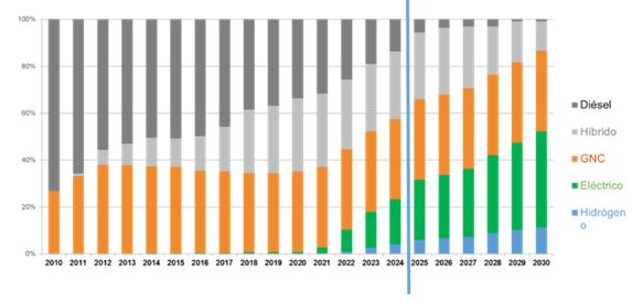 L’aposta de TMB per la sostenibilitat a la seva flota de bus es mostra en el següent gràfic on es pot veure com evolucionarà el nombre de vehicles per tipus de combustible, reduint els dièsel i els híbrids mentre guanyen terreny els elèctrics i els d’hidrogen.