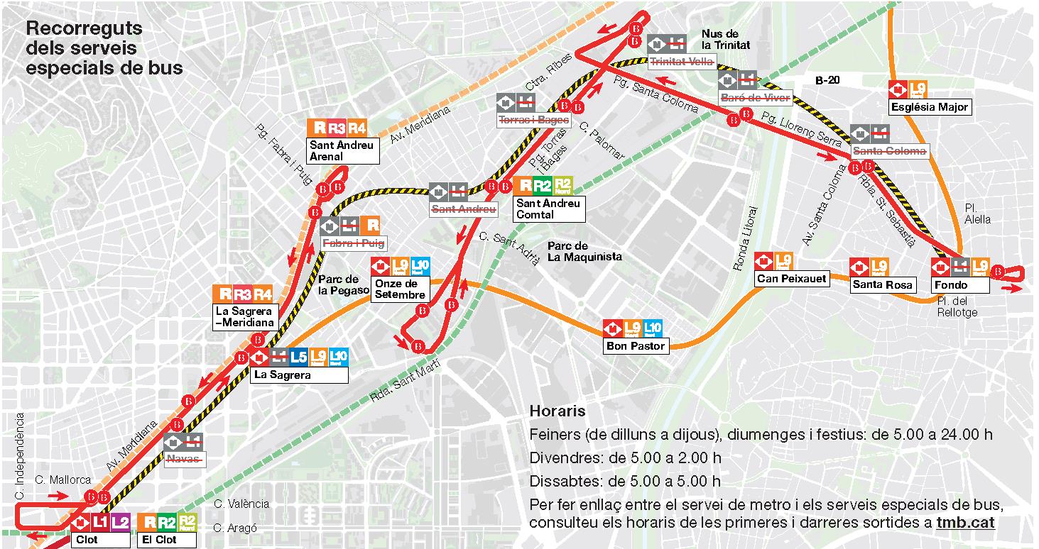 Amb motiu de la suspensió del servei de la línia 1 de metro entre les estacions de Clot i Fondo, del 29 de juny al 30 d’agost, Transports Metropolitans de Barcelona (TMB) recomana com a alternatives principals per als usuaris afectats la línia 9 Nord i la línia 5 de metro, per la seva freqüència i capacitat, que es reforçaran aquests dos mesos, així com diverses línies de Rodalies. A més, com a complement, hi haurà autobusos especials que faran el paper de distribuir usuaris entre les estacions tancades i les línies de metro i tren recomanades.