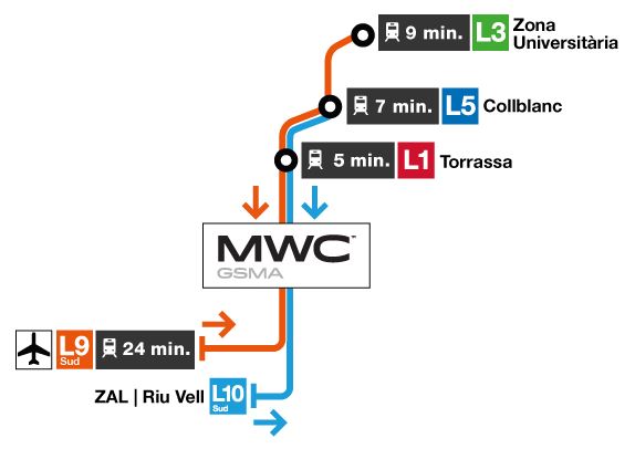 TMB recomana accedir al MWC en metro amb l’L9 Sud a les estacions de Fira i Europa | Fira i amb l’L10 Sud estació Foc. La línia 9 Sud enllaça el recinte firal Gran Via directament amb les terminals T1 i T2 de l’aeroport del Prat i té correspondència amb altres línies de metro que connecten amb Barcelona: L1 (Torrassa), L5 (Collblanc) i L3 (Zona Universitària), a més de l’L8, les línies suburbanes i les regionals d’FGC (Europa | Fira).