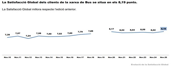 La satisfacció global de les persones usuàries de la xarxa de Bus durant el 2025 es situa en els 8,19 punts mentre que la satisfacció a Metro arriba als 8,21 punts, els valors més alts registrats mai