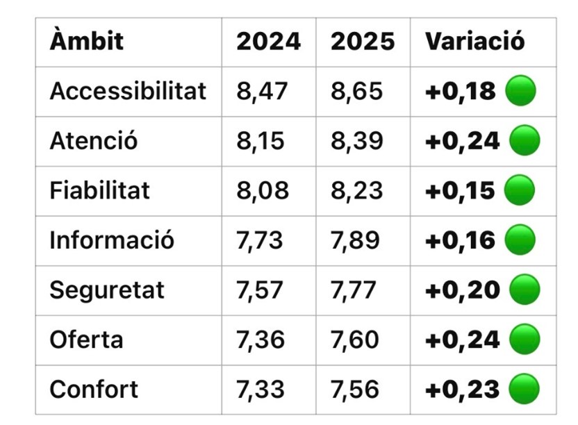 A la xarxa de bus, els àmbits més ben valorats fan referència a l’accessibilitat (8,65), i a l’atenció a l’usuari (8,39), mentre que l’àmbit que més creix respecte al 2024 ha estat el de l’oferta, amb un augment de 0,24 punts.