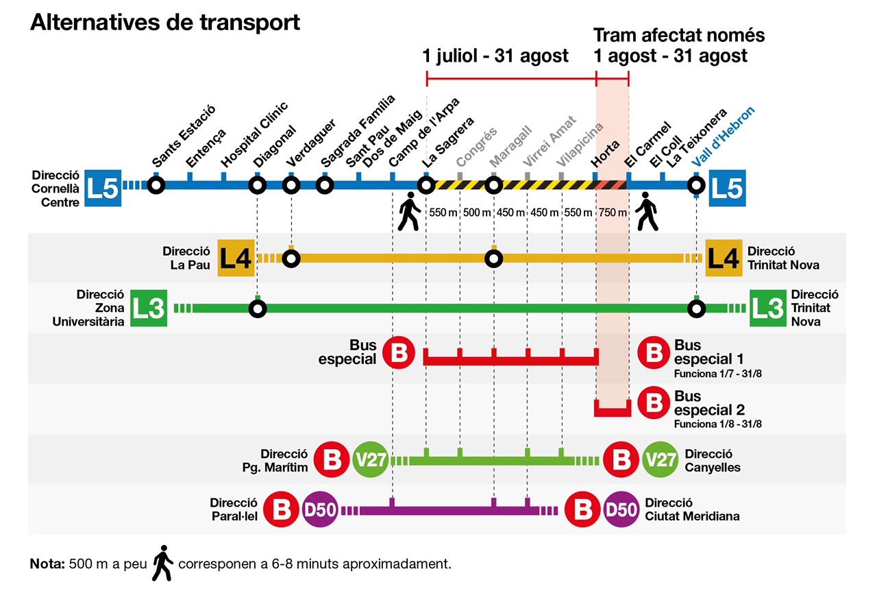 Durant les obres s'oferirà la xarxa de metro com a alternativa de mobilitat més eficient, reforçant fins a un 20% (depenent de la franja horària) les línies 1, 2, 3 i 4, respecte a l’oferta habitual. Les línies regulars de bus de la zona afectada pel tall, especialment la V27 i la D50, ofereixen un servei complementari al de la llançadora en aquesta zona. Tant al juliol com a l’agost es disposarà d’un servei d’autobusos llançadora amb un recorregut similar al de l’L5. Es posaran en servei 19 vehicles articulats per donar el màxim de freqüència, en un recorregut complementari als trams afectats, sense col·lapsar el trànsit de la zona afectada.