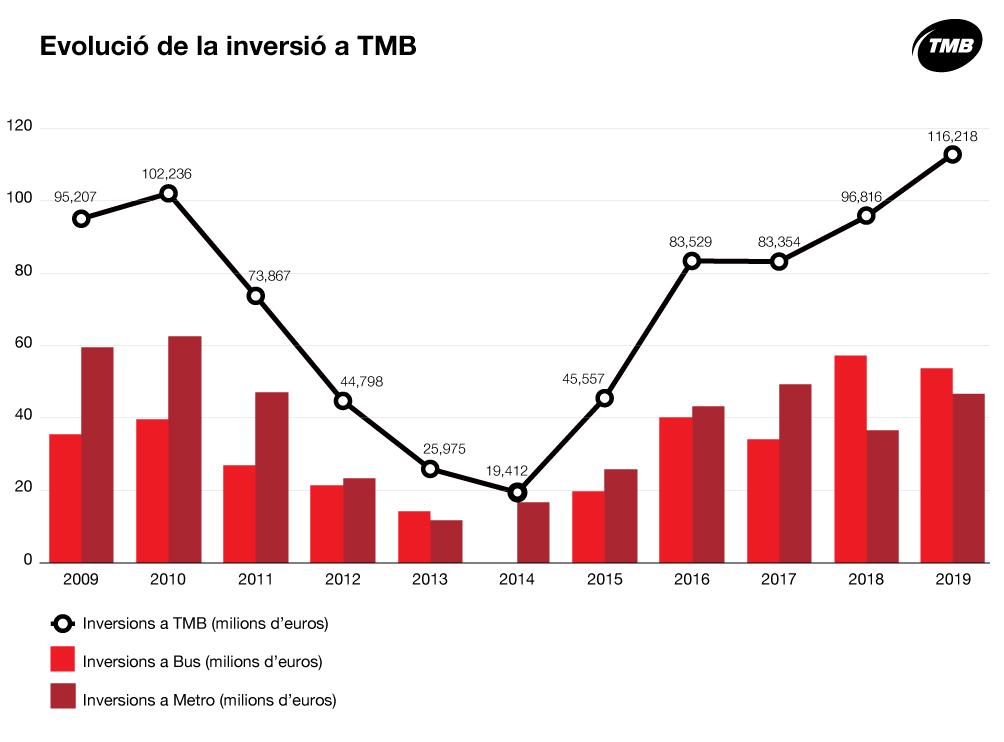 Transports Metropolitans de Barcelona (TMB) ha executat l’any 2019 un pressupost d’inversions de 116,2 milions d’euros en les xarxes de metro i autobusos així com als sistemes tecnològics i de comunicacions de les àrees de negoci i de l’entorn corporatiu amb vista a la millora del servei i l’aposta per la sostenibilitat. Aquesta xifra és la més elevada de l’últim decenni, com es pot comprovar en el gràfic de més avall, i supera en un 20% la inversió efectuada l’any anterior.
