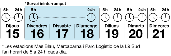 A més, cal destacar que les nits del 16 i 17 d’agost el metro funcionarà de forma continuada; per tant oferirà 67 hores de servei sense interrupció. Els trens circularan des de les 5 de la matinada de divendres, 16 d’agost, fins a les 12 de la nit del dia 18 (és a dir, fins a la finalització del servei de diumenge). Tot plegat suposarà un important element per afavorir la mobilitat de les persones que vulguin assistir a les diferents activitats programades per a aquestes nits.
