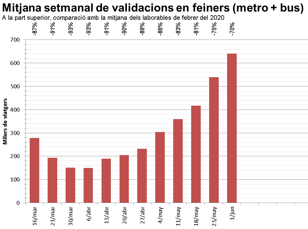 La mitjana diària d’aquesta segona setmana de fase 1 ha estat de 642.000 validacions al metro i el bus els quatre dies que van del 2 al 5 de juny, quan la mitjana dels feiners de la setmana anterior (del 25 al 29 de maig) va ser de 539.000: és a dir, s’han fet 103.000 viatges diaris més. En comparació amb els 417.000 de l’última setmana de fase 0, del 18 al 22 de maig, han estat 225.000 viatges diaris més, el 54%.
