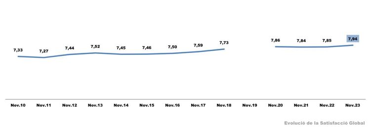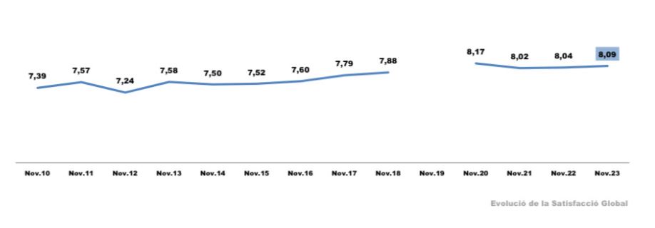 Els gràfics mostren l'evolució dels dos índexs des del 2010 (el 2019 no es va realitzar l'estudi) d'una satisfacció global que es calcula fent la mitjana de les puntuacions donades pels enquestats als diferents serveis: una nota única que resumeix la seva experiència com a usuari.