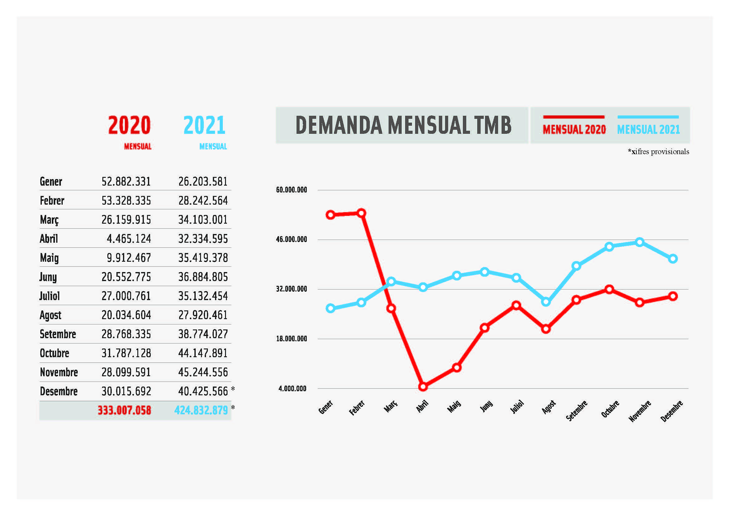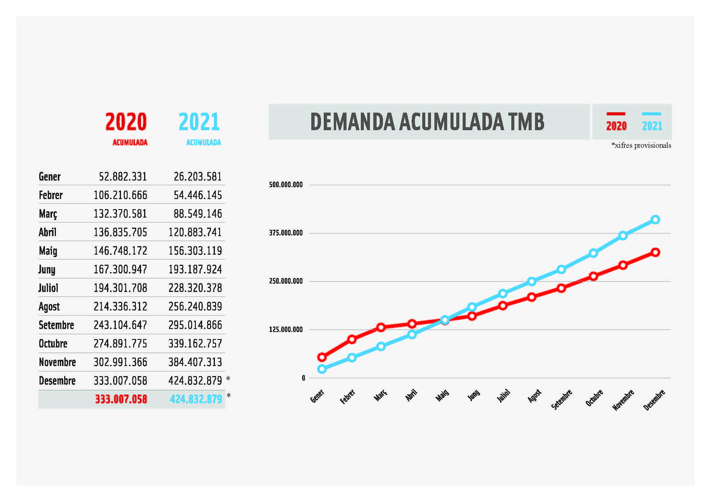 El metro i els autobusos de Transports Metropolitans de Barcelona (TMB) van tancar el 2021 amb 424,8 milions de viatges, un increment de prop de 92 milions respecte de l’any anterior, equivalents al 27,6%, segons les dades provisionals de tancament de l’exercici. Es va iniciar així el camí de la recuperació de la demanda perduda amb l’esclat de la crisi del coronavirus el març del 2020.
