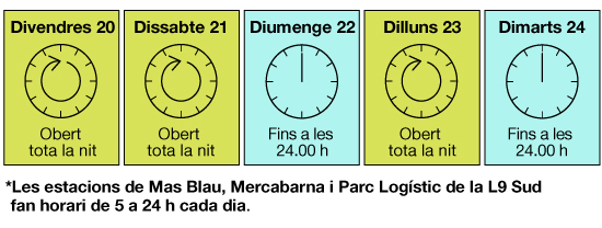El metro funcionarà sense interrupció les nits de divendres 20, dissabte 21 i dilluns 23 de setembre, per afavorir la mobilitat en transport públic i també durant les nits. Així, els trens circularan des de les 5 de la matinada del divendres 20 de setembre fins a les 12 de la nit del diumenge 22. El metro tornarà a donar servei ininterromput la nit de dilluns 23, així els trens circularan des de les 5 del matí de dilluns a les 12 de la nit de dimarts 24.